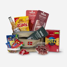- Innhold: Kjølebag med norsk flagg, Eplemost Tystad Fruktgård Raud Aroma 0,33l, Serranoskinke skivet 55g, Fuet skivet 100g, Chorizo skivet 100g, Baby Bell Mini Ost 120g, Ritz kjeks 200g, Taga Salchicon spekepølse 225g, Kim Salt Crunch 30g, Påskeegg 12 cm Norske klassikere 160g.