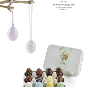 - 2 stk rombe påskepynt hvit og lilla fra Lyngby Porcelæn. Eggekartong 115g. Innhold: 4 stk marsipanegg, 4 stk mini luksusegg, 4 stk belgiske fugle-egg